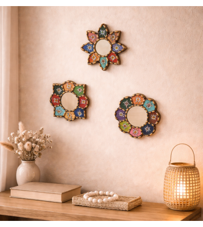 Magnifique miroir aux couleurs de l'arc-en-ciel qui incarne le riche patrimoine artistique du Pérou, inspiré par la période coloniale. Style Cuzcaja, il utilise la technique du verre peint à la main à l'envers. Il est composé d'un cadre en bois recouvert de feuille de bronze. Le résultat est un miroir qui dégage un charme vintage rappelant la période coloniale. Élevez votre décoration intérieure avec une touche d'art et d'histoire péruvienne. C'est un bel ajout à votre collection de décorations d'intérieur.