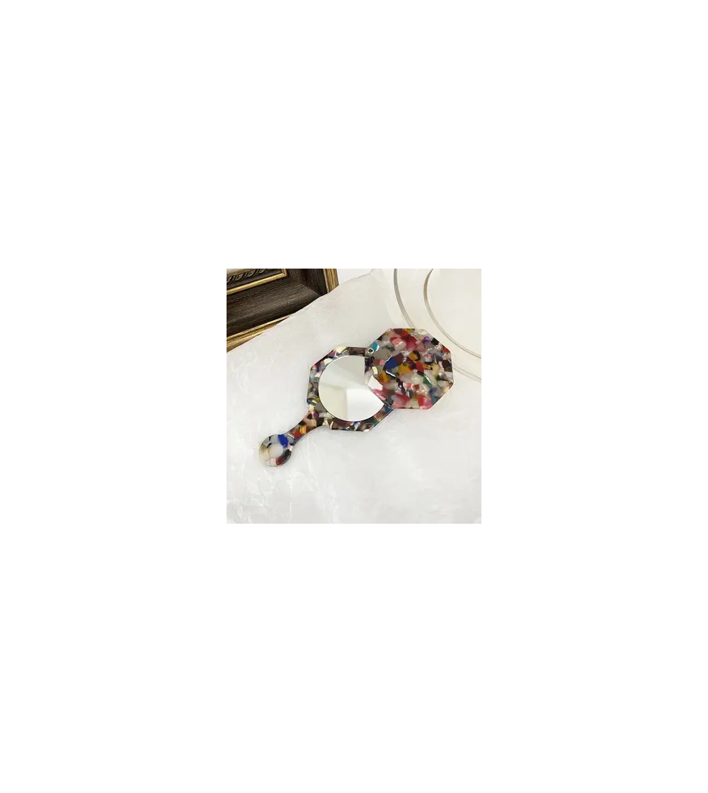 Mini miroir à main au design mosaîque multicolore. Compact et léger, il est idéal pour se glisser dans un sac à main ou une trousse de toilette pour les retouches beauté à tout moment.